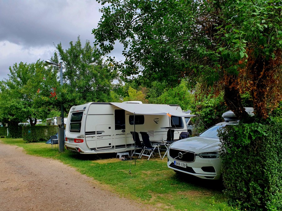 Verdunin leirintäalue Les Breuils Camping Verdun. Puun takia moverilla aisa edellä pensaaseen. Pois otettiinkin lihasmoverilla ja naapurin avulla.