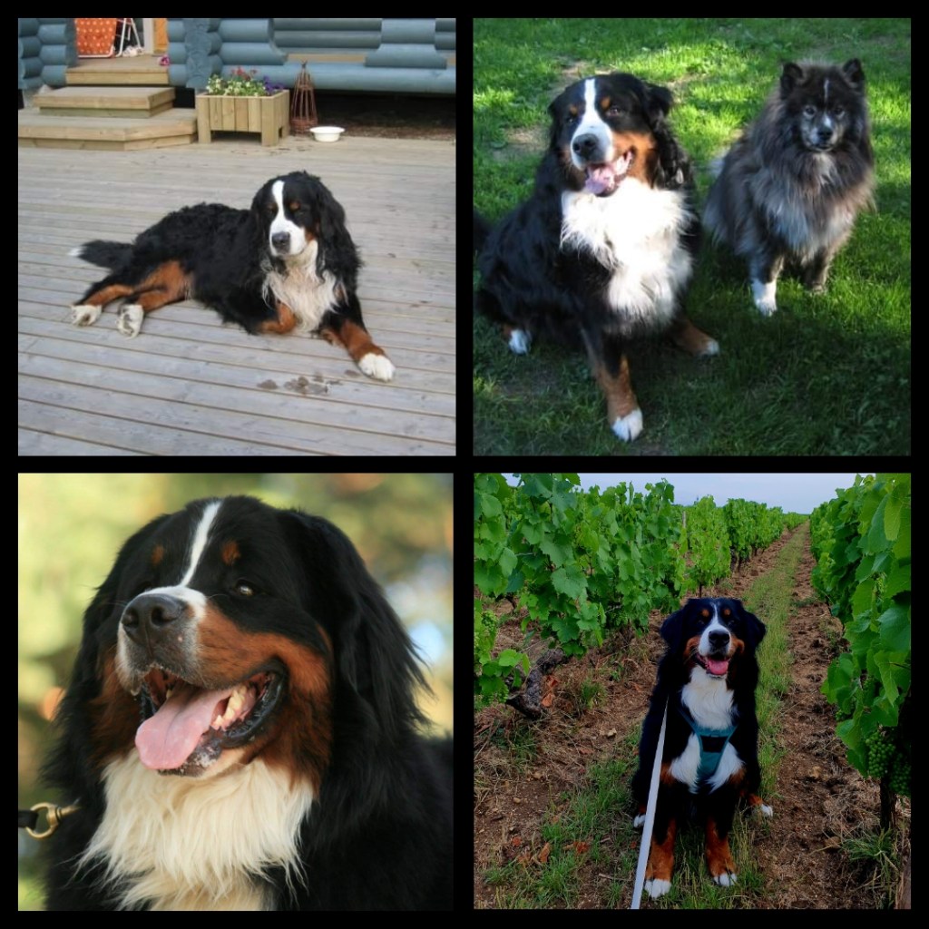 Ajatus tuonnista ulkomailta lähti siitä, että nyt se kesälomareissun yhteydessä olisi mahdollista. Aiempien berniemme elinikä on ollut valitettavan laskusuuntainen: Rocky 10 v (vasen yläkuva), Ricky 8 v 4kk (oikea yläkuva jossa mukana myös vaimoni lapinkoira Eetu) ja Roope 6 v 8kk (vasen alakuva) ja Ronja (oikea alakuva).