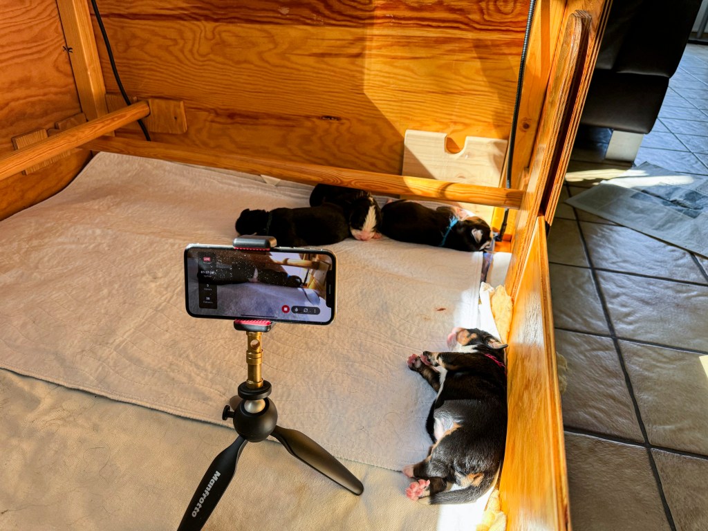 Kasvattaja perusti heti synnytyksen jälkeen yhteisen Whatsapp-ryhmän heidän ja valittujen pentujensaajien kesken. Lisäksi meillä oli mahdollisuus seurata pentujen kehittymistä lähes 24/7 ”WelpenTV:n” eli netin välityksellä tapahtuvan lähetyksen kautta.