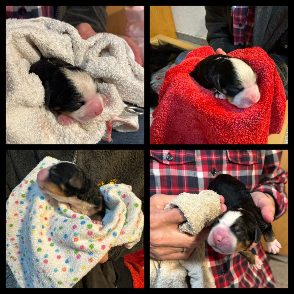Perjantaina 26.4 sain soiton Jürgenilta ja tiedon, että pennut olivat syntyneet edellisen yönä. Ultranperusteella arvioitu lukumäärä oli osunut oikeaan. Pentuja oli yhteensä 2 tyttöä ja 2 poikaa. Valitettavasti viides pentu oli syntynyt kuolleena.