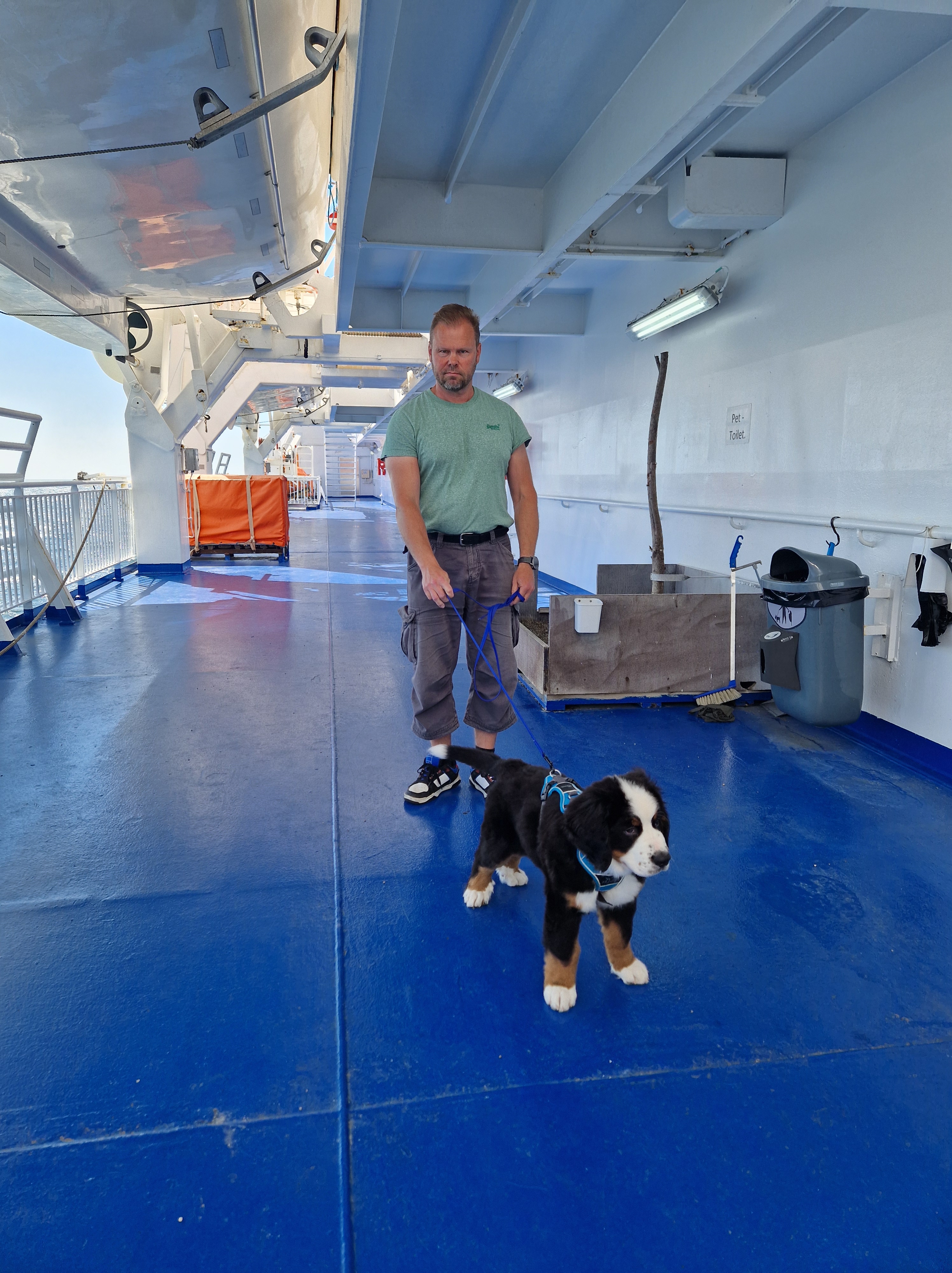 Loppureissu meni loistavasti niin leirintäalueella matkailuvaunussa kuin laivalla Saksasta Suomeen tulessa. Tunnelma oli toki tiivis, kun samassa tilassa oli kaksi aikuista, kaksi teiniä ja kaksi berniä. Paluumatkalla meillä oli vain 3 hengen hytti, kun muita lemmikkieläin hyttejä ei enää ollut saatavissa, vaikka liput ostimme jo hyvissä ajoin edellisen vuoden marraskuussa. Lemmikkien kanssa laivalla matkustaessa suurin rajoittava tekijä onkin lemmikkihyttien rajoitettu saatavuus.