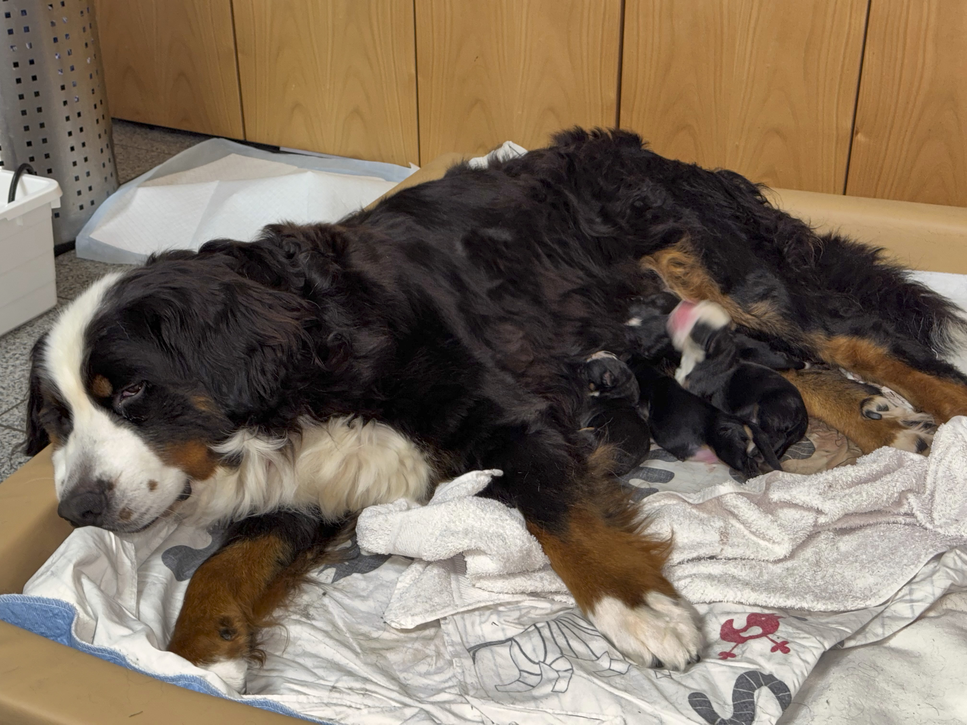 Perjantaina 26.4 sain soiton Jürgenilta ja tiedon, että pennut olivat syntyneet edellisen yönä. Ultranperusteella arvioitu lukumäärä oli osunut oikeaan. Pentuja oli yhteensä 2 tyttöä ja 2 poikaa. Valitettavasti viides pentu oli syntynyt kuolleena.