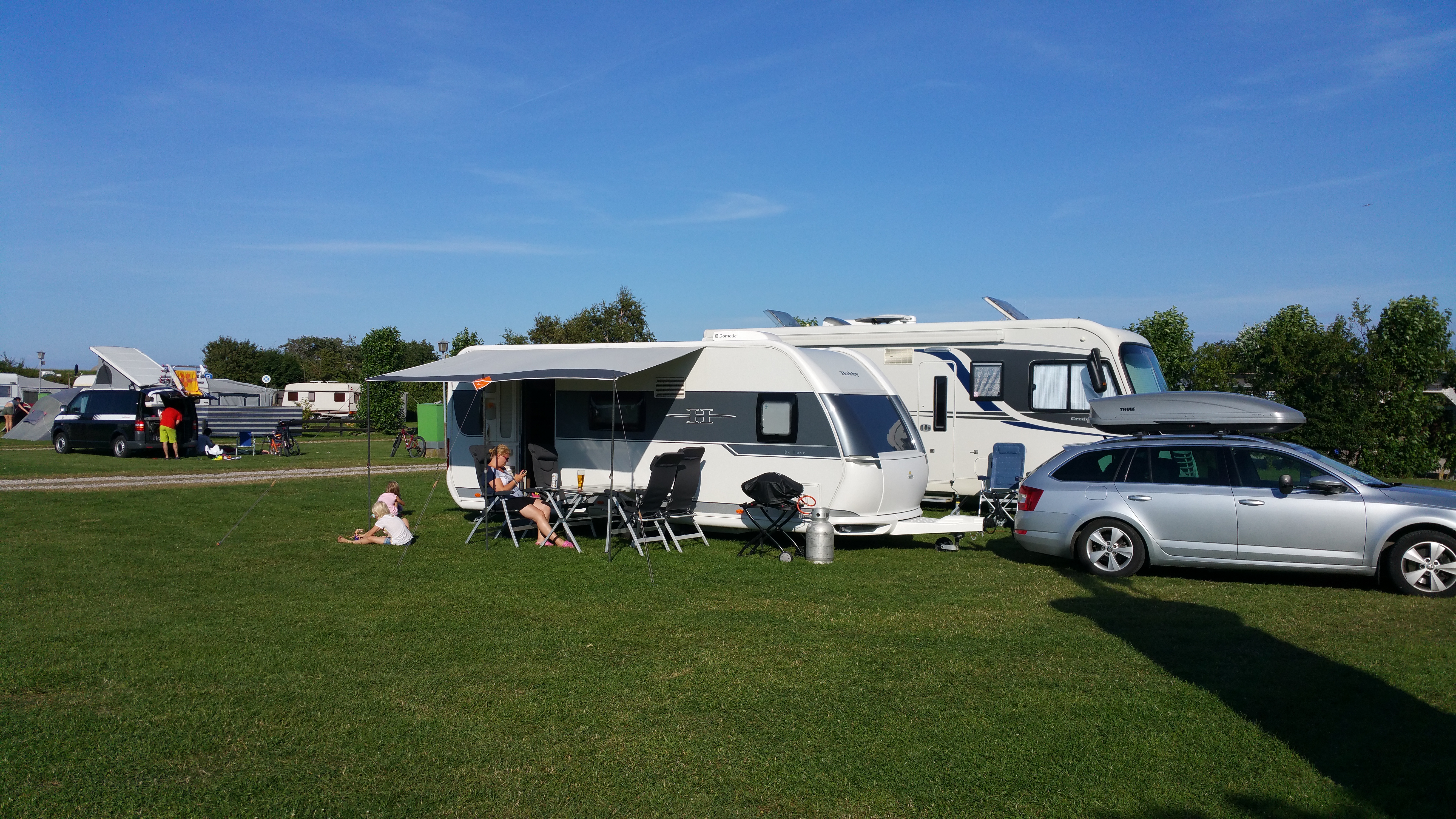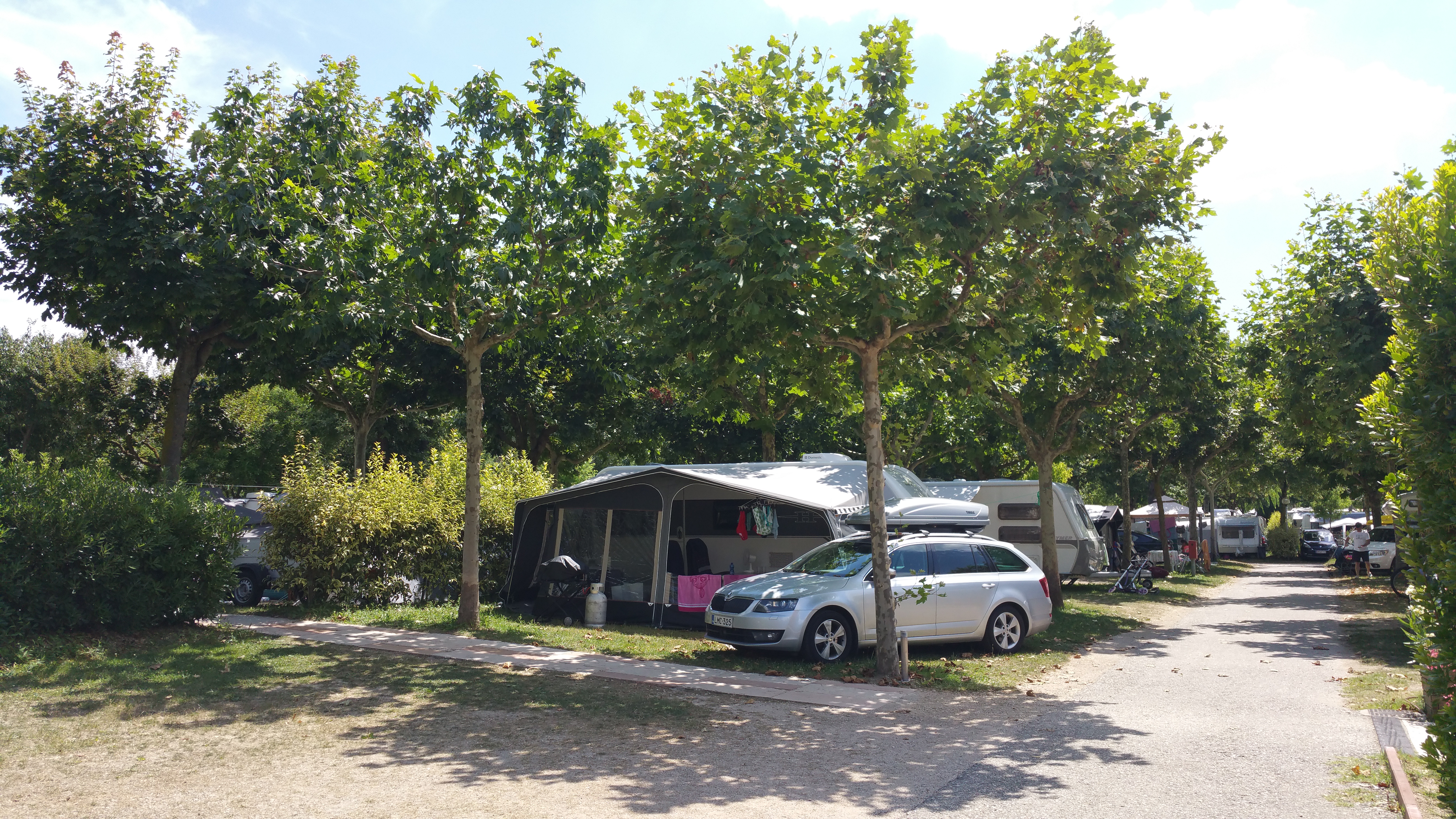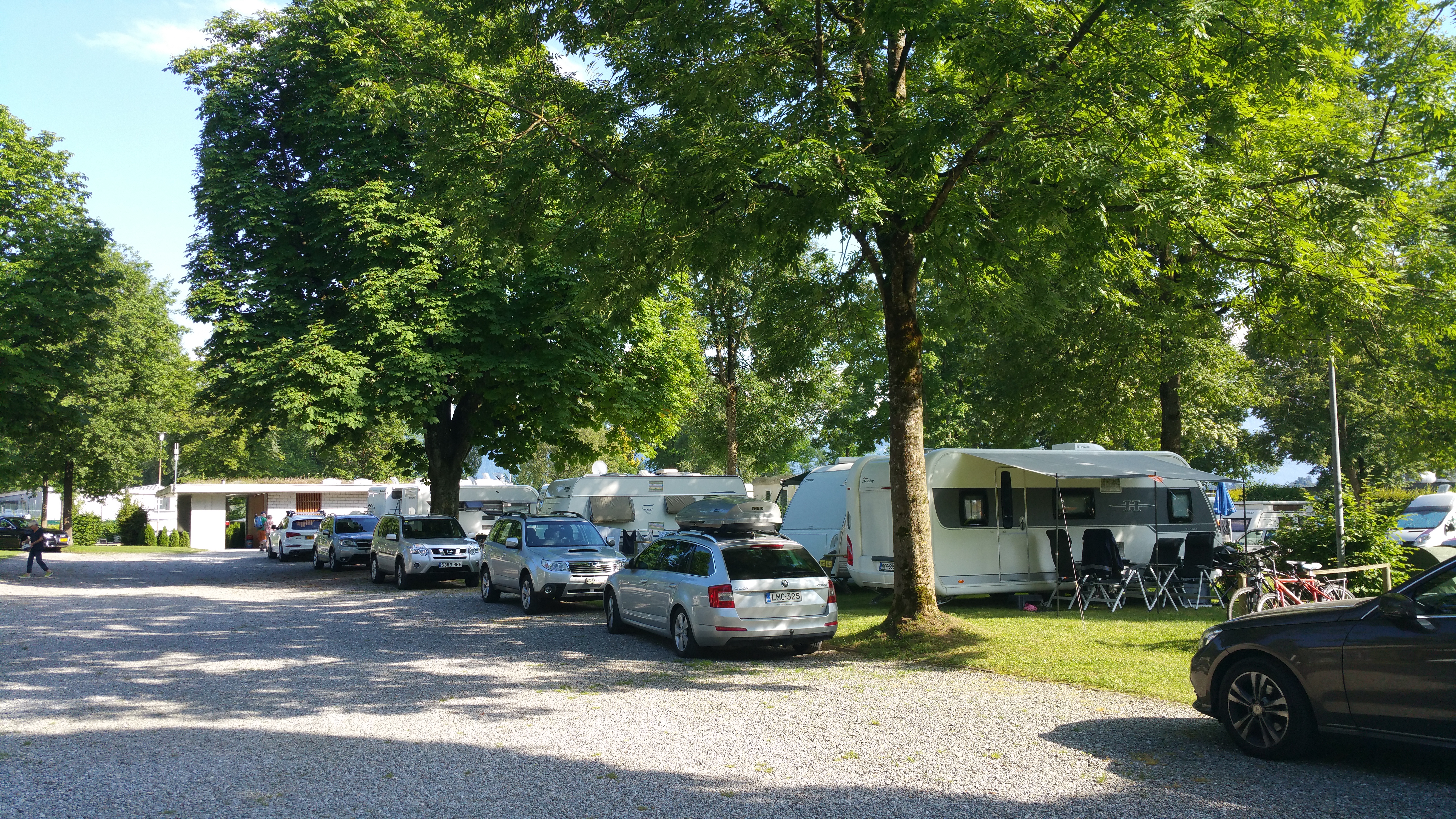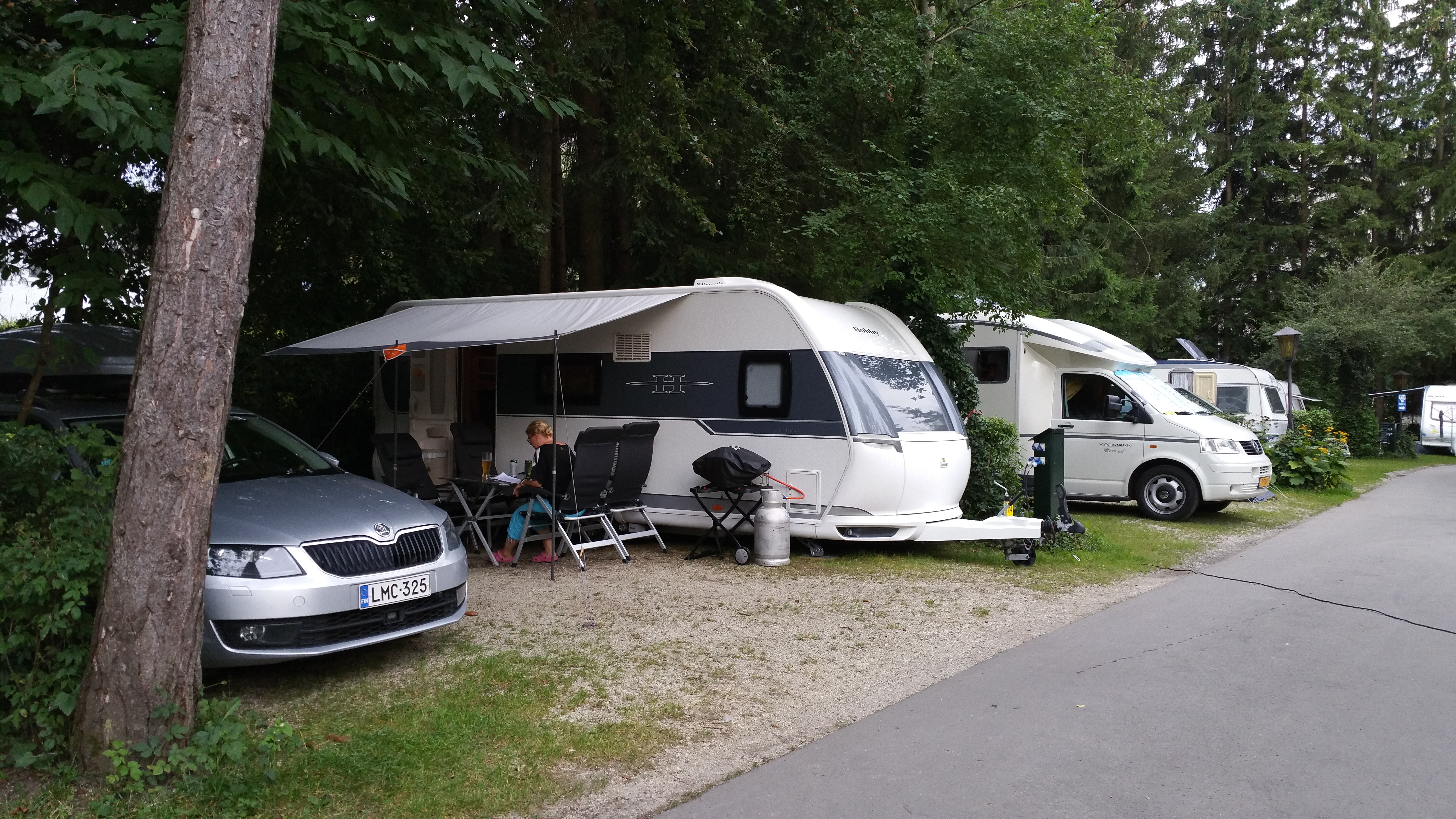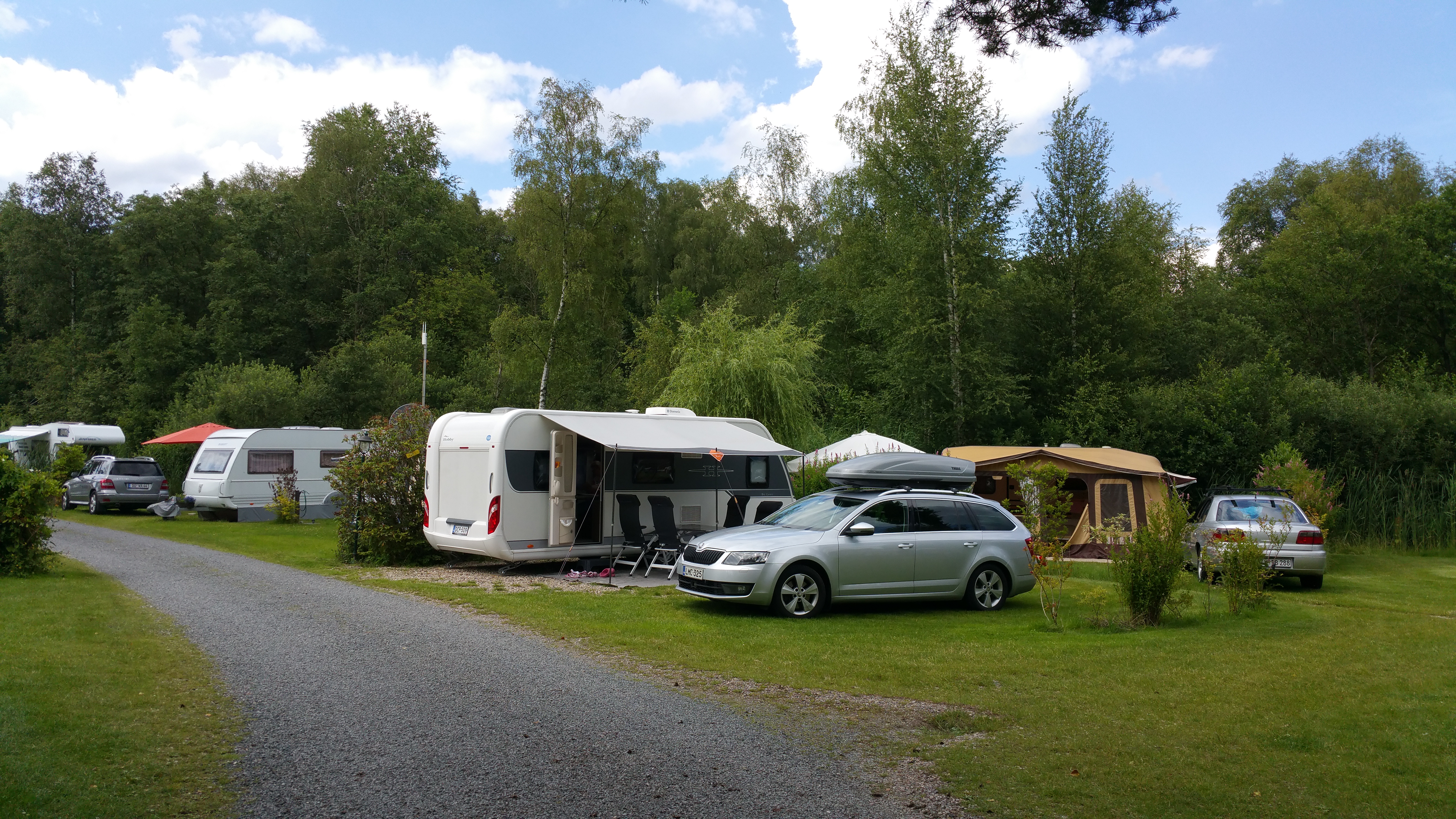 Ajettuamme portista sisään oli ensi vaikutelma ”että tällainen paikka…”. Oli nimittäin selvää että paikka on pieni, ahdas ja täynnä. Tietyllä tapaa paluuta ei enää ollut kun yhdistelmä oli pihassa ja paikanpitäjä oli jo siinä vieressä esittelemässä mahdollisia leiripaikkoja. Valitsimme näistä vähiten huonon ja vaunumme tuli toisen vaunun teltan eteen parkkiin (eivät kuulemma olleet tulossa tälle kausipaikalle nyt…). No kyllähän se siihen mahtui mutta katoksen pystyttämisestä ei tarvinnut haaveilla. Paikasta jäi jotenkin omituinen fiilis ja mustalaisleirimäinen tunnelma.