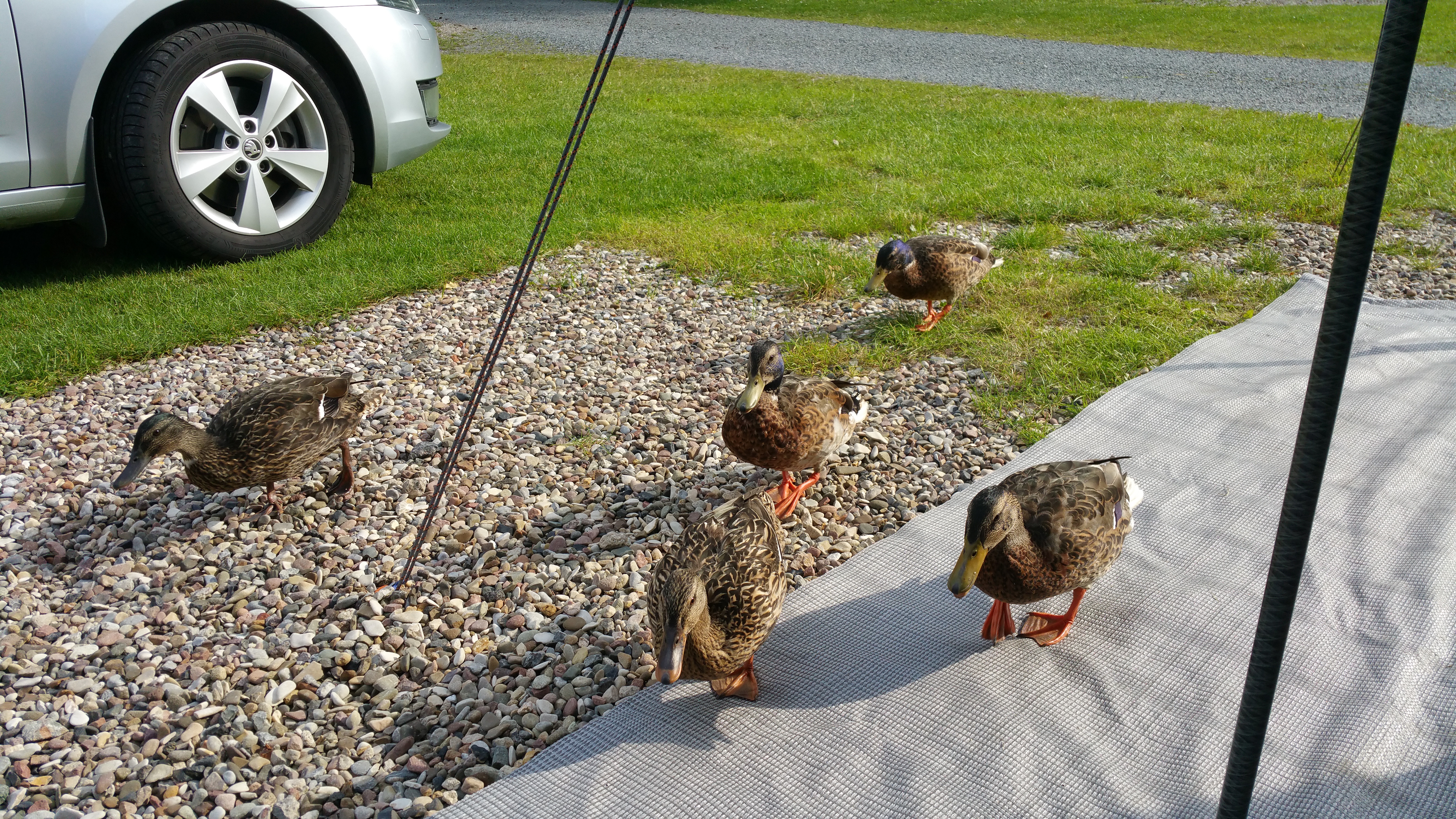 Matkalla sääennusteen ”voimakkaat ukkosmyrskyt” muuttuivat todeksi. Vettä tuli taivaan täydeltä ja tuuli puuskissa oli myrskyluokkaa. Suurin osa autoista pysähtyi teiden varsille mutta me jatkoimme ajoa kohti lertsaa. Mielessä pyöri että mitähän siitä meidän katoksesta on enää jäljellä… Ilmeisesti ihan pahin oli kiertänyt tuon alueemme ohi ja toisaalta Peggypegin ankkurit olivat näyttäneet kyntensä puhuria vastaan sillä katos oli paikoillaan ihan kuin lähtiessämmekin.