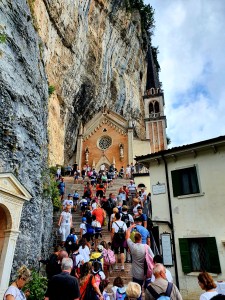 Santuario Madonna della Corona on noin vuonna 1625 valmistunut, vuoren rinteeseen rakennettu kaunis kirkko, jossa on rauhallinen tunnelma. Noin siis jonkun esittelytekstin mukaan. Porukkaa oli tosi paljon liikenteessä ja mukana lapsiryhmiä, joten tunnelma ei varsinaisesti ollut rauhallinen. Kirkolle saa kävellä ja korkeuserot on suuret. Uskomattomassa paikassahan tuo sijaitsee. Kirkossa oli sisällä portaat mitkä olisi tekstin perusteella tullut kontata ylös ja joka askelmalla rukoilla. Oli aika hiljaista noissa portaissa ja jäi myös meiltä kokeilematta.